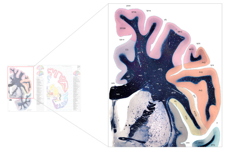 Fiber (myelin) stained sections with major fiber tracts identified and with color-coded sulco-gyral features.